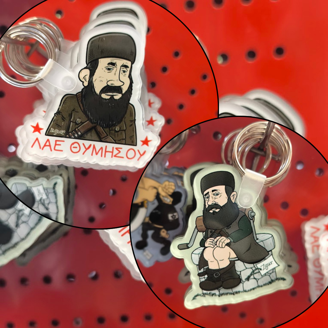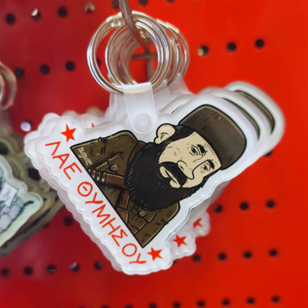 Κατασκευάσαμε το μπρελόκ με ανθεκτική εκτύπωση και επιλέξαμε σχέδιο που πιάνει το μάτι –και την ψυχή των συντρόφων– από την πρώτη ματιά. Δεν αρκεστήκαμε σε κάτι απλώς όμορφο. Θέλαμε να δημιουργήσουμε μικρές χειρονομίες μνήμης, ειρωνείας και ταξικής συνείδησης, που κουμπώνουν ιδανικά σε τσάντες, κλειδιά και καθημερινές αφορμές για κουβέντα.