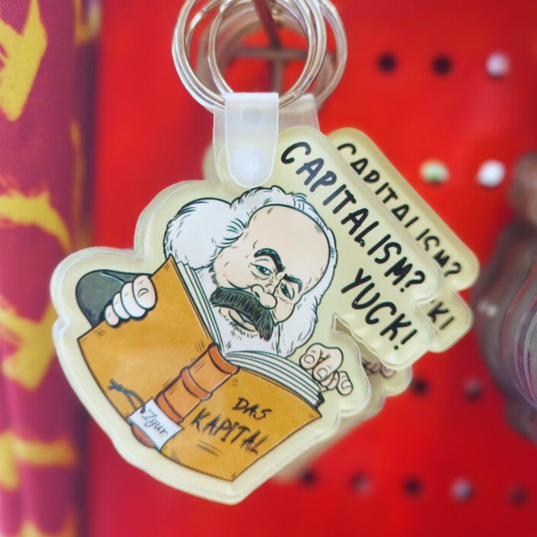Ο Κάρολος Μαρξ επιστρέφει, όχι με μανιφέστο, αλλά με μπρελόκ. Και όχι απλώς μπρελόκ, αλλά ακρυλικό και ανθεκτικό σε κάθε καπιταλιστική πρόκληση. Το σχέδιο του Zgur δεν αφήνει πολλά στη φαντασία: ο Marx κρατάει το Das Kapital και δηλώνει ξεκάθαρα: “Capitalism? Yuck!”