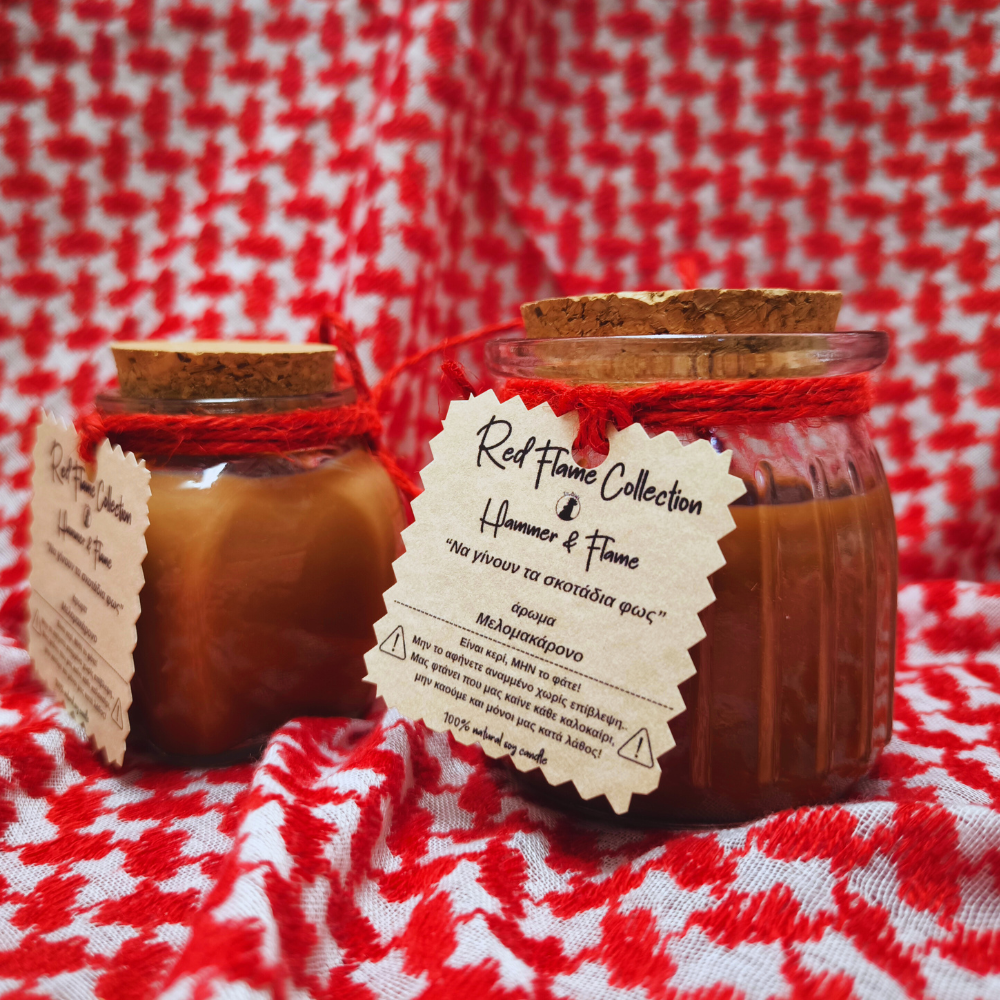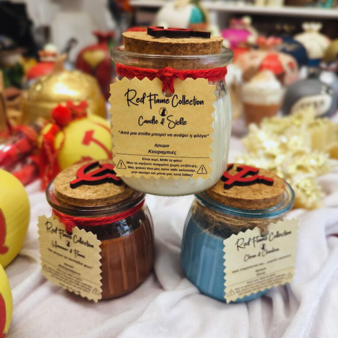 Επειδή δεν ξέρουμε πού θα φτάσουν οι τιμές σε κουραμπιέδες και μελομακάρονα… το φτιάξαμε σε κερί! Hammer & Flame: μελομακάρονο Candle & Sickle: κουραμπιές